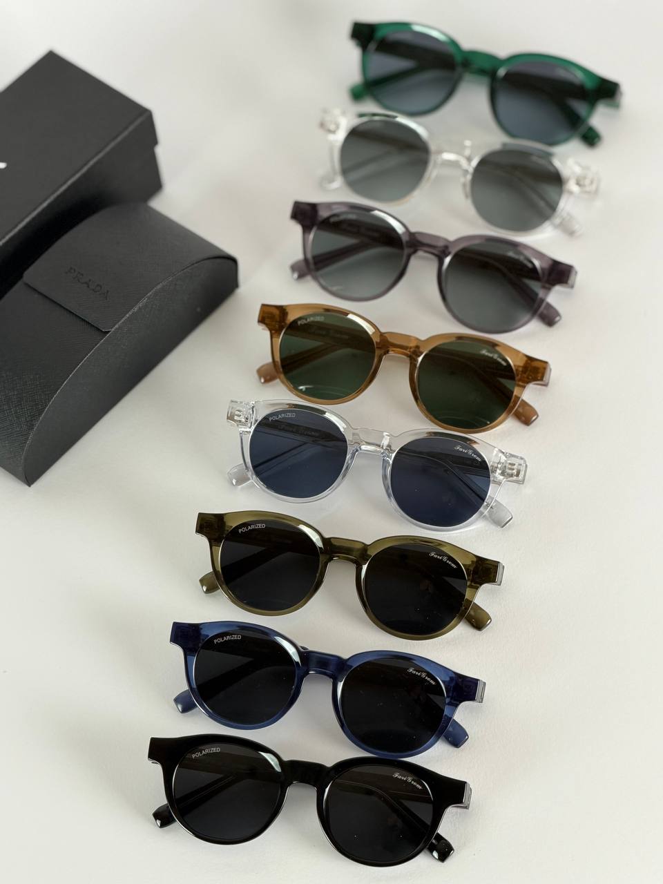 عینک افتابی از برند پرادا کیفیت مسترکوالیتی دسته سیم کاملاًمنعطف ونشکن فریم استات درجه یک لنز یووی ۴۰۰وپلاریزه وضوح دید عالی